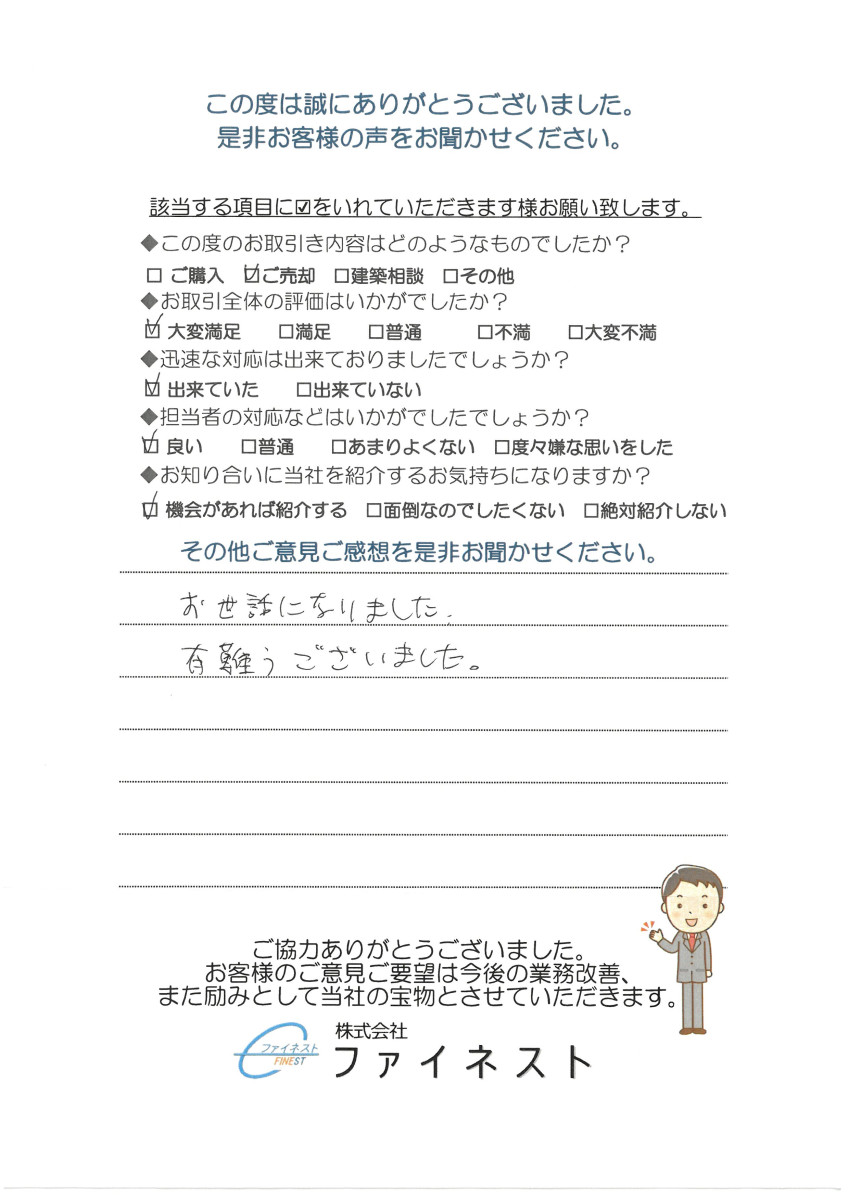 I様には大変感謝しております。初対面でお会いした時から無条件に私の事を信用していただき不思議な気持ちと期待に応えたいという気持ちで一生懸命対応させていただきました。結果としてご購入もご売却も予定通りとなりホッとしております(^^♪