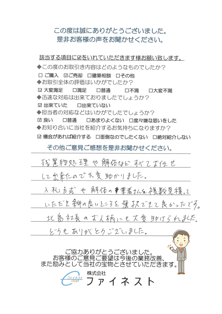 残置物処理や測量、解体工事など、全て最善のご提案で進めることができて何よりです。